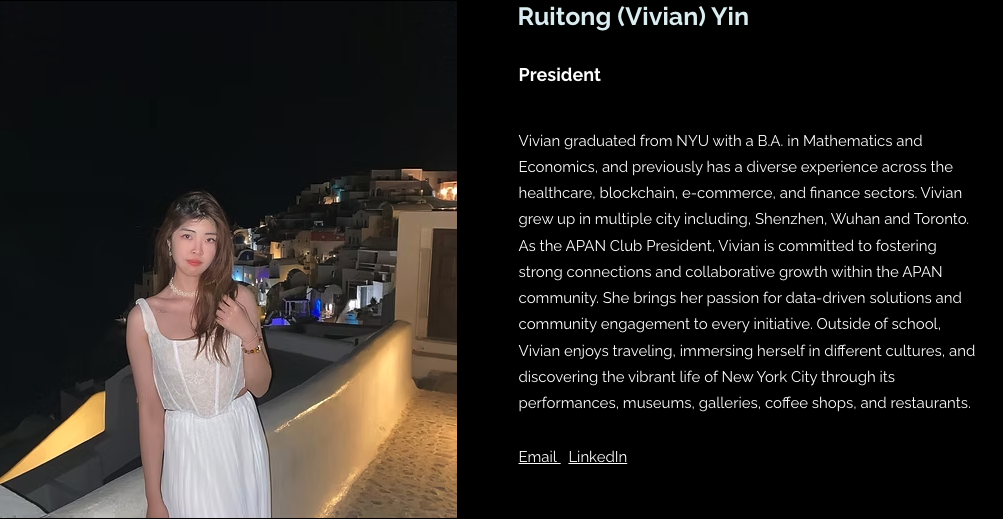 APAN Club is the largest student organization in Columbia University's School of Professional Studies with over 1000 active members. As the President of APAN Club, I led a dynamic board team of 30+ students to